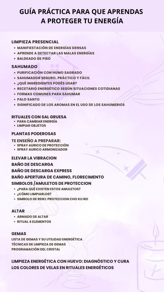 Este libro, creado por Pamela Luz Díaz, es una guía práctica y sencilla para que aprendas a limpiar, proteger y elevar la energía de tu hogar, tu negocio y de ti misma. A través de rituales con hierbas, sal, velas, gemas y sahumados, descubrirás cómo armonizar tus espacios, atraer abundancia y recuperar la paz interior. También aprenderás técnicas con amuletos, símbolos, baños de descarga, sprays áuricos y la poderosa limpieza energética con huevo.